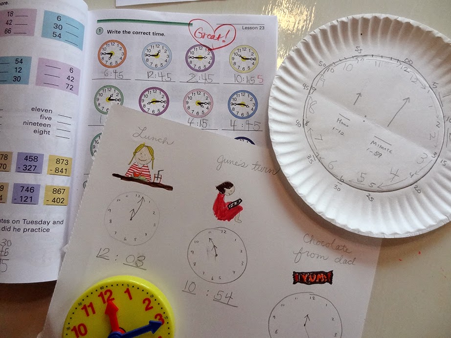 She wanted to do more so I made up some printable pages. I drew in the drawings, and will let Lou write "when the clock coo coos," "the baby cries," and "lunchtime." You could easily mix it up by writing in the event and letting them draw the picture, or writing in a time, and let them watch the clock to see what's happening when the time rolls around.